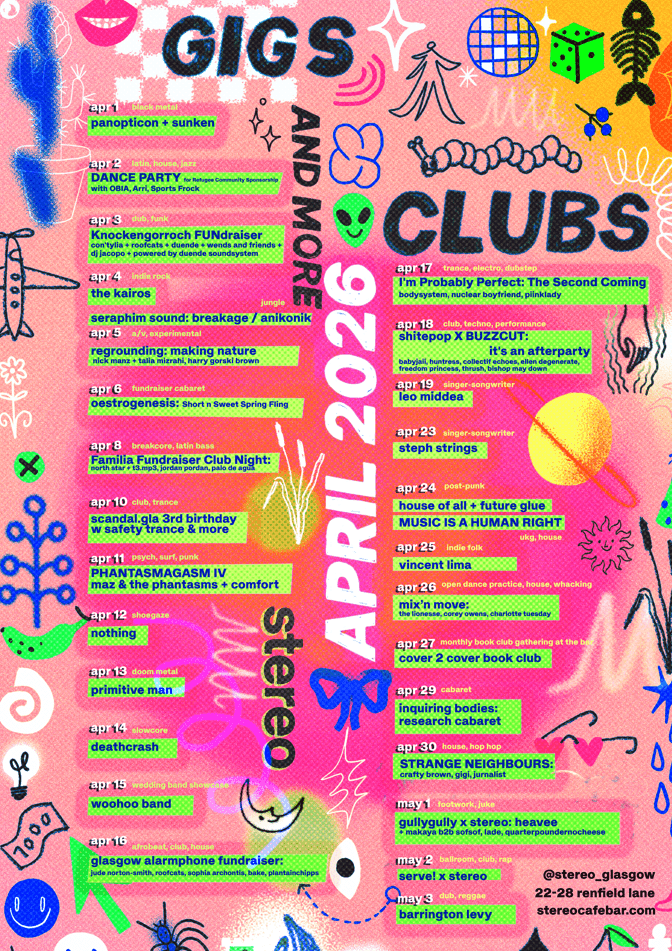 Stereo is a grassroots, independent venue and café, rooted in DIY culture, experimentation, and community, - going strong from 2007!